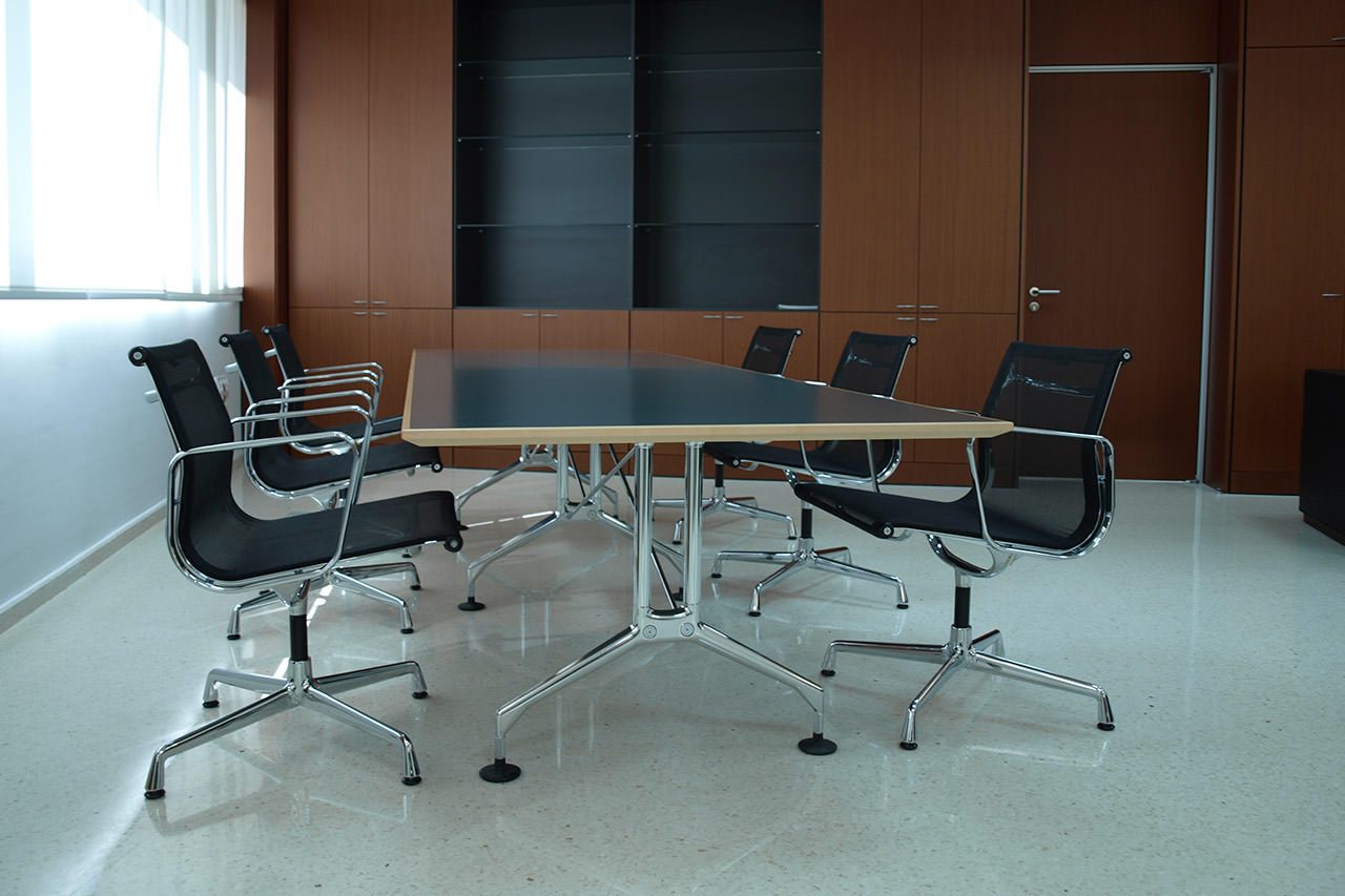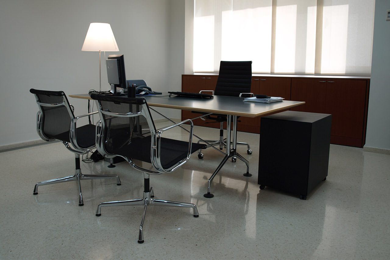 El mobiliario para oficinas fue seleccionado atendiendo a criterios de ergonomía, durabilidad y coherencia estética. En los despachos de dirección, las mesas de trabajo, almacenaje y elementos auxiliares se integran en una composición sobria y elegante, transmitiendo autoridad y confort a partes iguales.